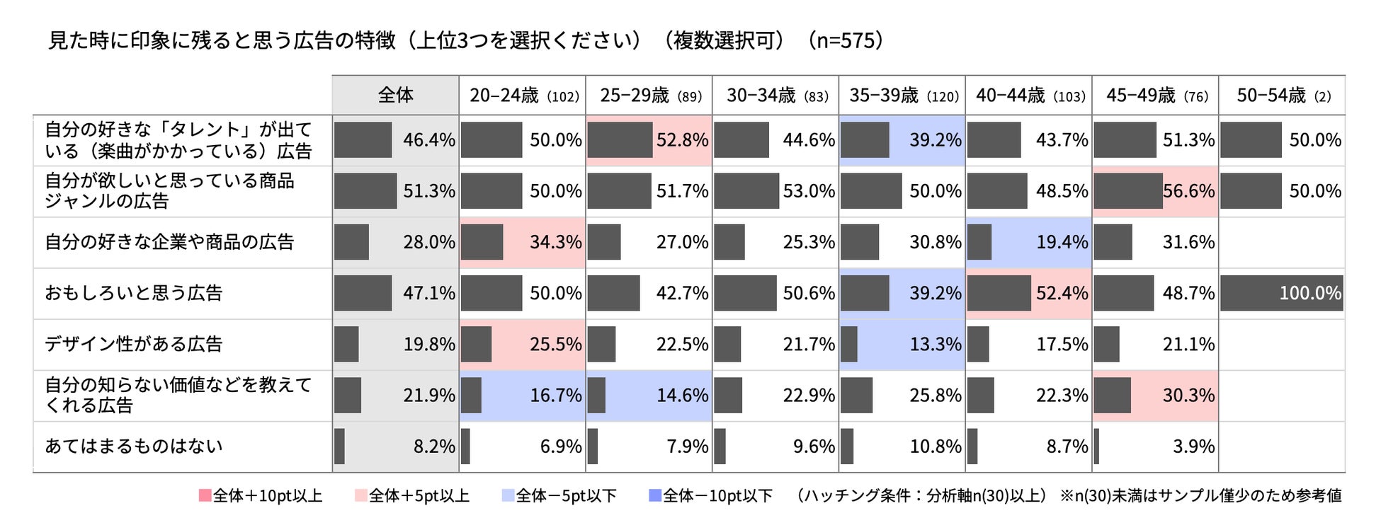 また、好きなタレントが出てるもしくは好きな音楽が使われてるものや、興味あるジャンルのCM動画は全世代で印象に残りやすい傾向にあり、知っているタレントや好きなタレントが出演しているCM動画についてはスキップされにくく、オンラインでのCM動画においてもタレントの力が高いことが伺えます。
