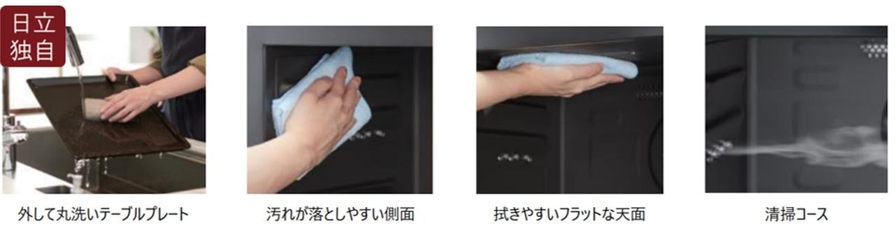 汚れても外して丸洗いできる日立独自の「外して丸洗いテーブルプレート」、シリコン系塗装を施し汚れが落としやすい庫内側面、ヒーターが露出していないので拭きやすいフラットな天面、大量のスチームで汚れが落としやすい「清掃」コースで、お手入れが簡単です。