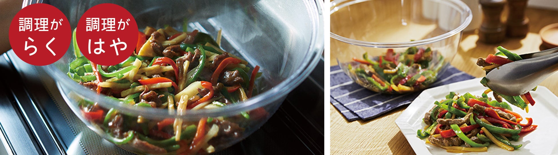 「野菜シャキシャキメニュー」や、「最短1分スピードメニュー」、煮物やいため物など、ボウルひとつでメイン料理から副菜までつくれるので、レパートリーが広がります。