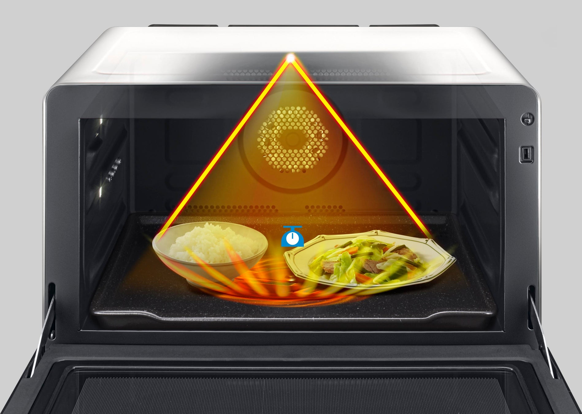2品の食品の表面温上昇をはかって、マイクロ波をコントロールし、温度の異なる2品を同時に効率よくあたためます。