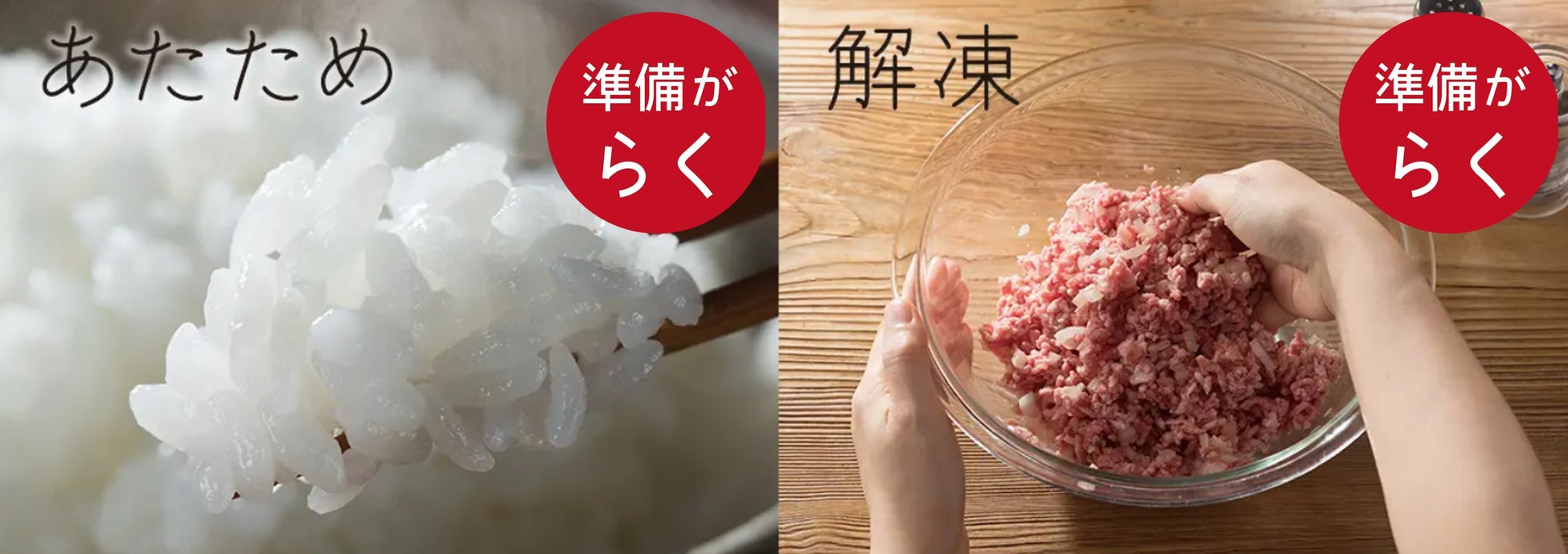 おいしい温度に適温(*8)あたためができ、ムラを抑えて(*9)肉・魚を解凍できるので、食事のしたくがスムーズになります。