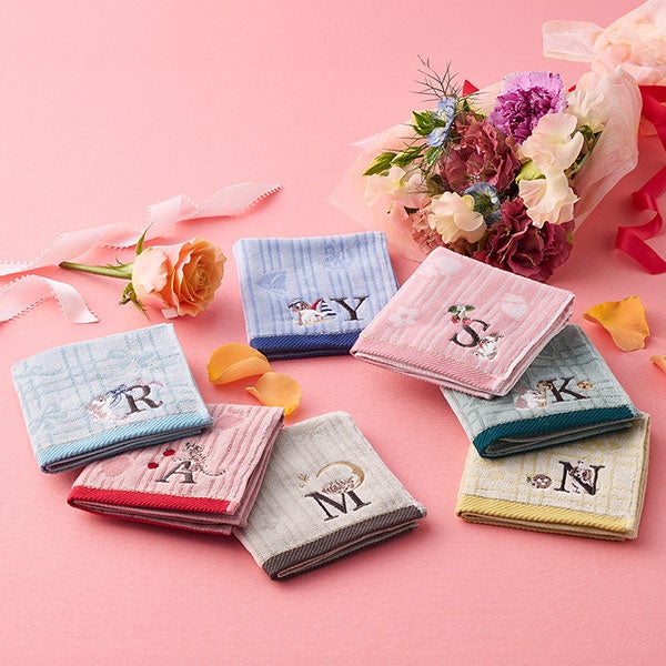 アルファベットの一つひとつに、動物たちの小さなストーリーを添えたイニシャルシリーズ。綿100%のふんわりとした肌当たりの生地で、大切な方へのギフトにもおすすめなアイテムです。イニシャルは、M/Y/A/S/N/R/Kの計7種類から1枚お選びいただきます。