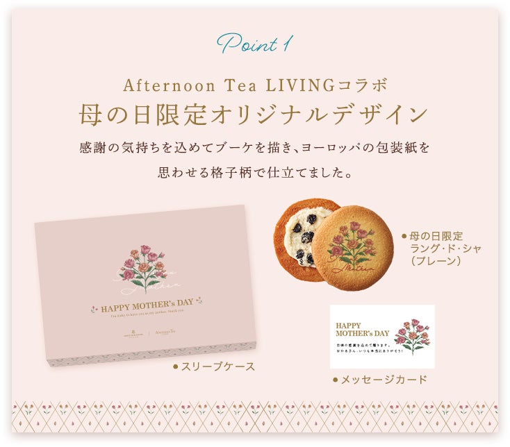 また、オンラインショップ限定商品として、Afternoon Tea LIVING の人気ミニタオルを詰め合せた特別ギフトや、ブーケミニタオル付きの「ラング・ド・シャ・アソート」の予約も開始しております。