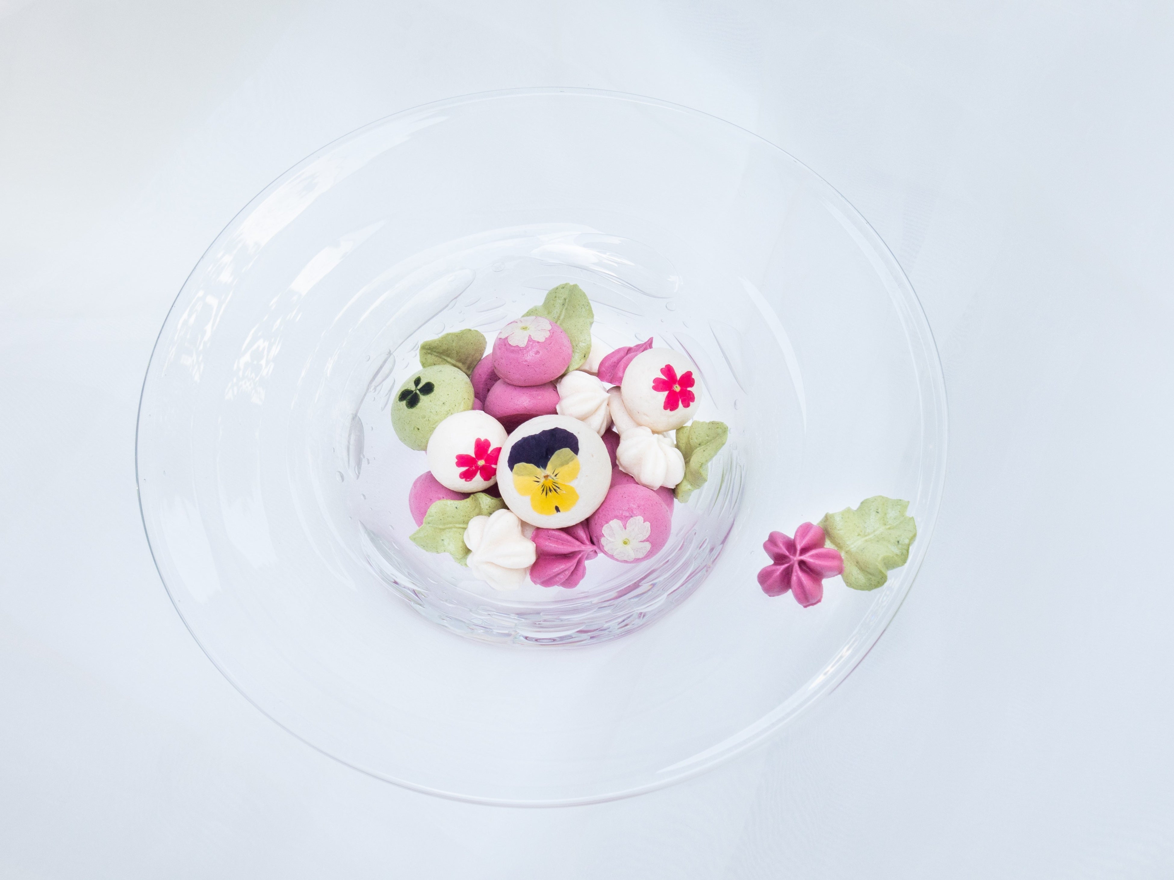 この商品のコラボスイーツは、エディブルフラワーを飾りつけた、まるで春のお花畑のような3種類のフレーバーが香るメレンゲクッキーです。