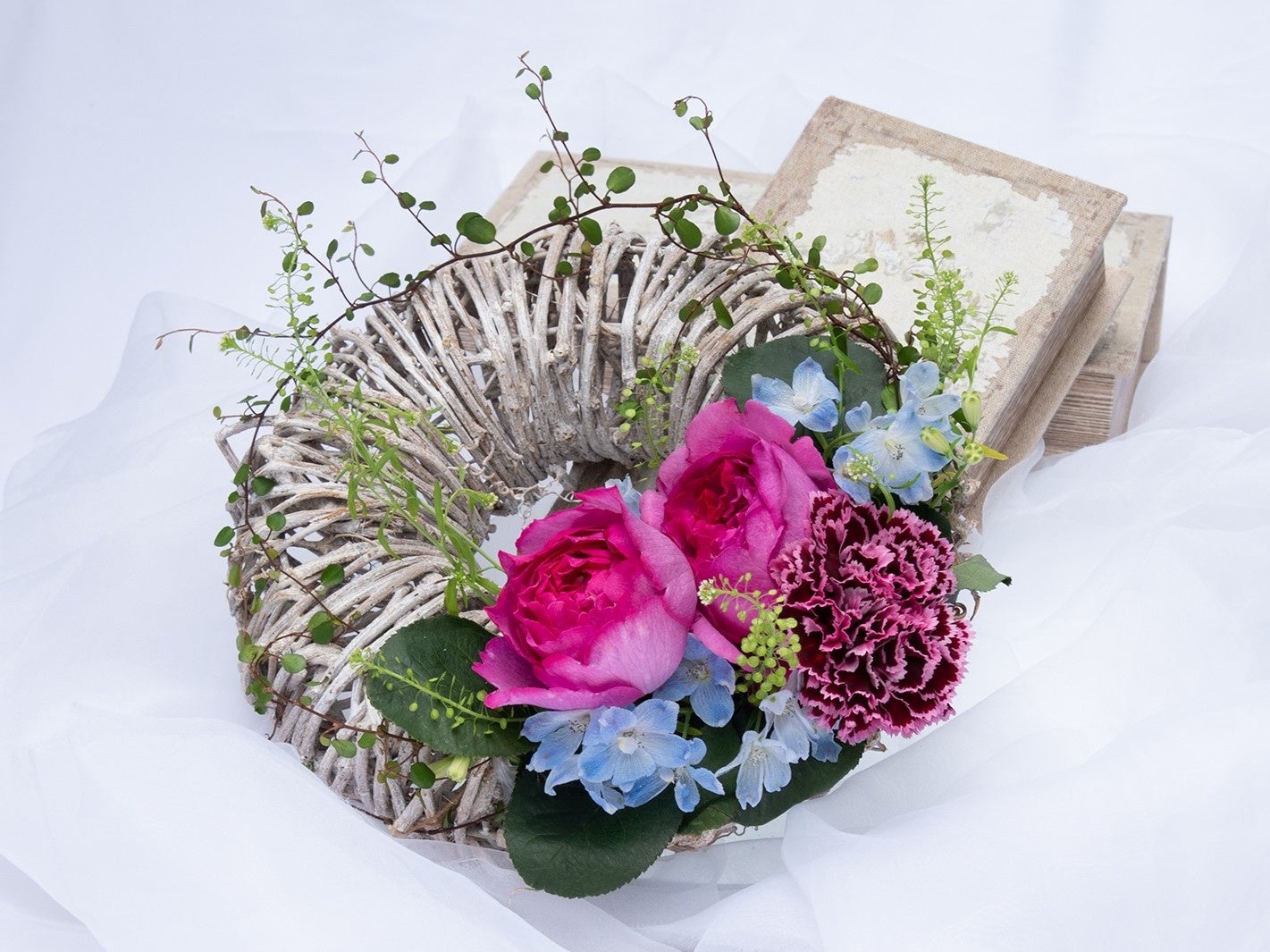 置いて楽しむテーブルリースです。ツルで仕上げたナチュラルなリースには、香りのよいバラと季節の草花をあしらいました。