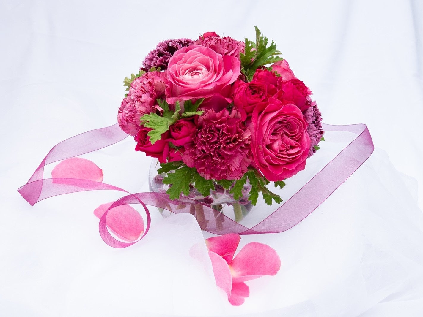 今年の母の日限定ビジューは、ボール型のガラスの花器に、母の日の定番カラーのルージュ色の花を合わせ、優雅でシックなブーケに仕上げました。