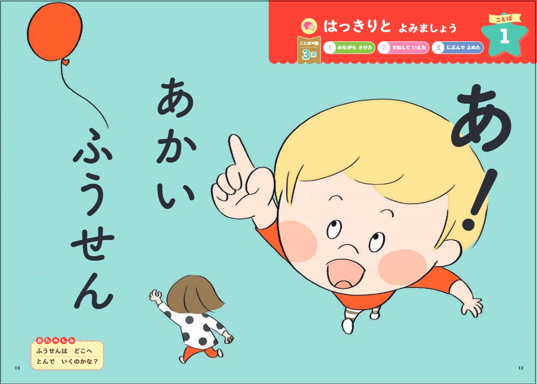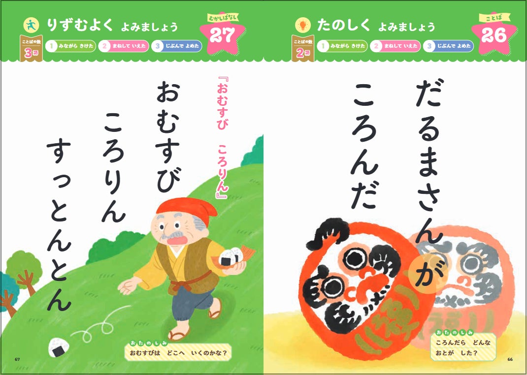 文章の難易度が発達に合わせて少しずつアップ。助詞などを区別して、ことばの認識&理解をサポートします。おんどくの後は、観察力と思考力を高めるクイズや質問の「おたのしみ」コーナーでブレイク。親子のコミュニケーションを楽しむことで、子どもも音読の時間が大好きになっていきます。