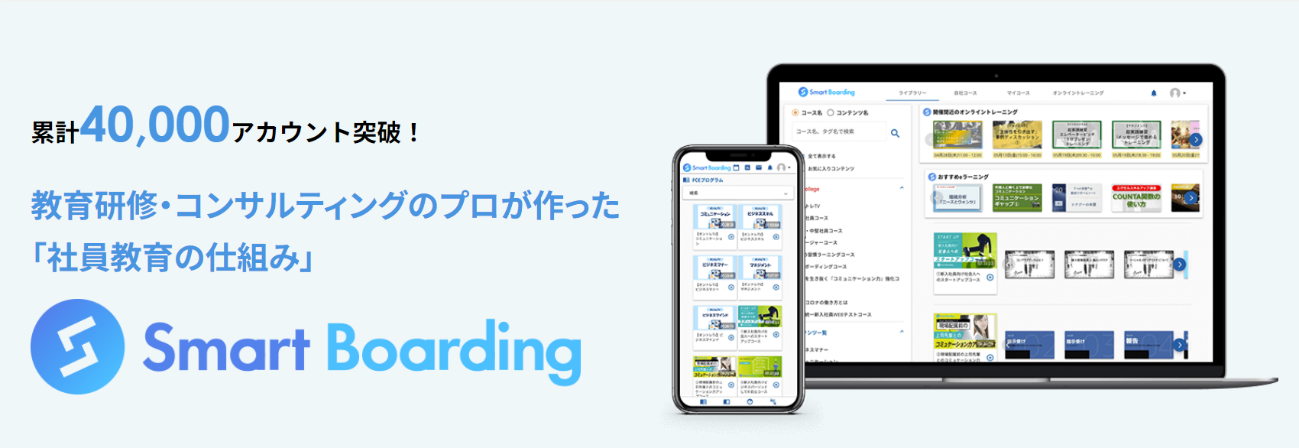 『Smart Boarding』は、累計導入アカウント数40000以上! 研修満足度94%※1、継続率98.6%※2 の教育研修・コンサルティング会社が提供する社員教育プラットフォームです。