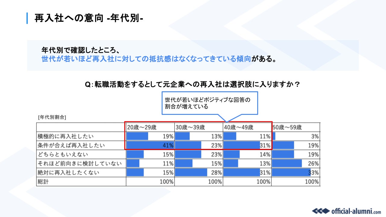 最後に再入社に対しての意向ですが、これも世代が若くなるほどポジティブに捉えていることが分かりましたが、同時に再入社が選択肢にある人でもやはり抵抗感は拭えないことがデータとしても明らかになったため、企業側としてはアルムナイの方が安心して戻ってこれるように受け入れの体制を整えておくことが重要です。