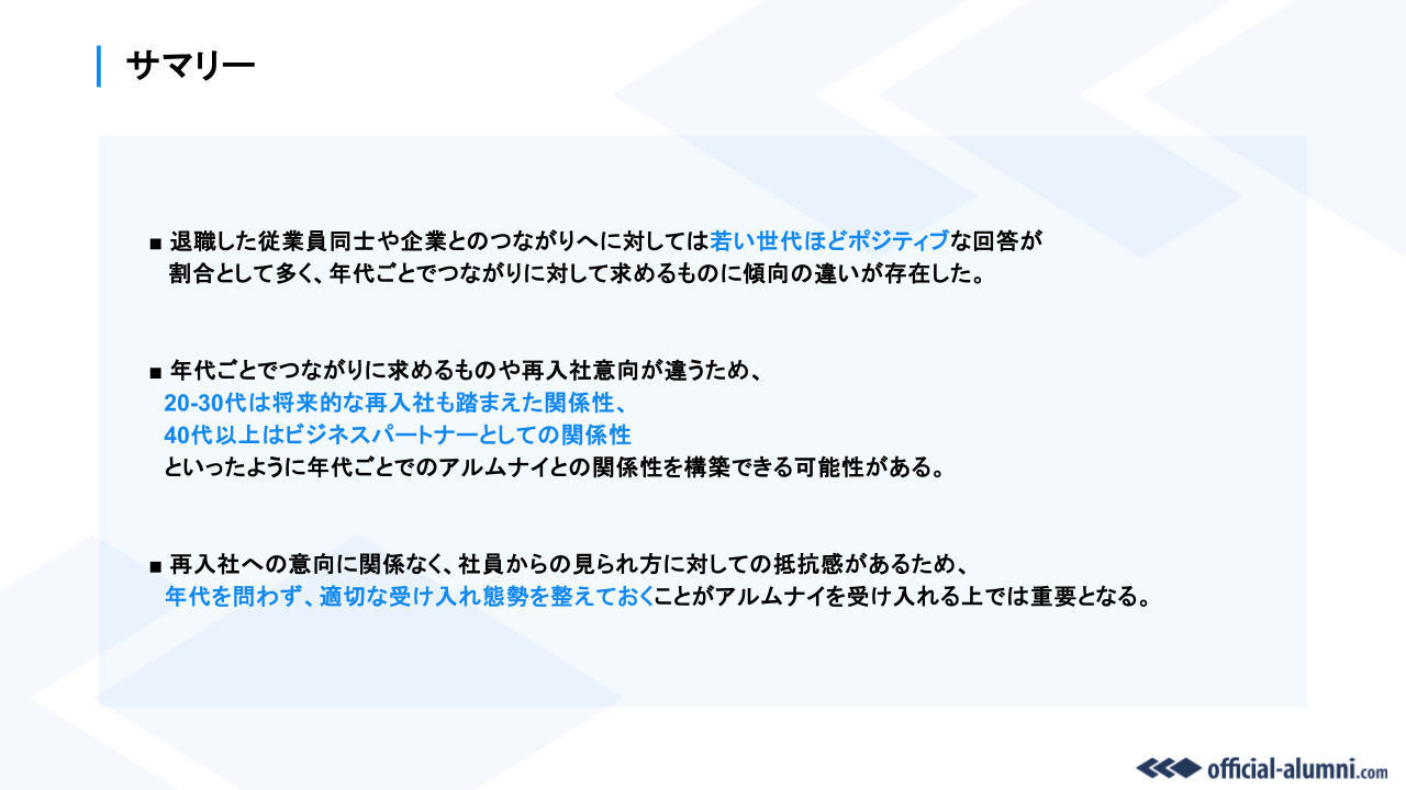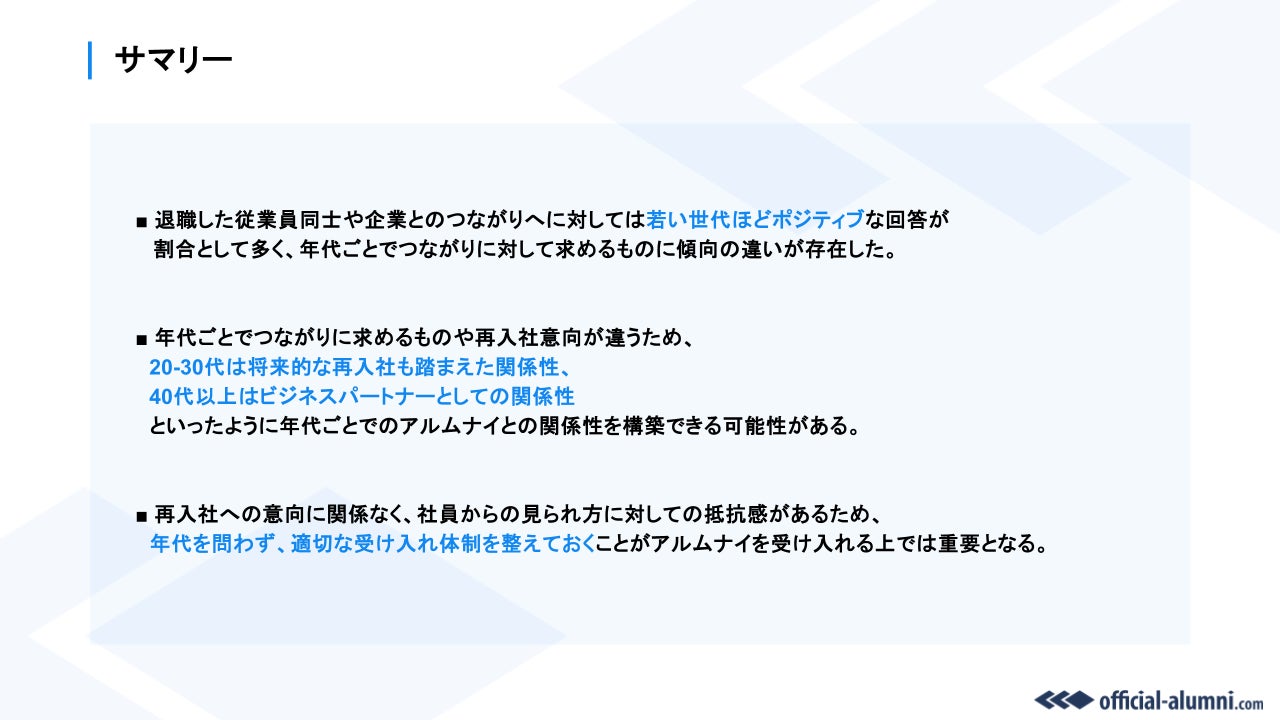 ・年代ごとでつながりに求めるものや再入社意向が違うため、20-30代は将来的な再入社も踏まえた関係性、40代以上はビジネスパートナーとしての関係性といったように年代ごとでのアルムナイとの関係性を構築できる可能性がある(※こちらの結果に関しては下記の調査概要にあるリンクからダウンロードしてください)。