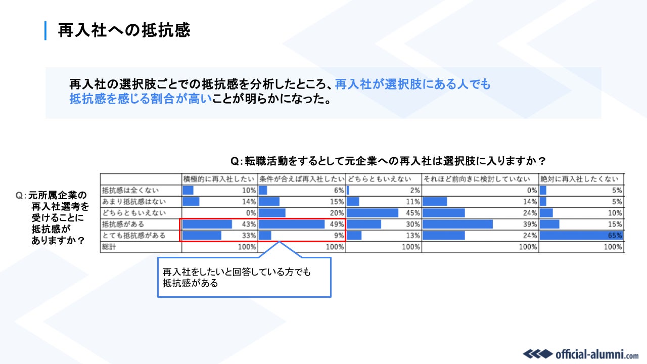 6:最後に再入社に対しての抵抗感を確認したところ、再入社したいと回答した人でも「抵抗感がある」、「とても抵抗感がある」と回答する割合は多く、別の質問では、特に再入社後の社員からの見られ方に抵抗感を感じると回答する割合が多かった(※別質問の結果は下記の調査概要にあるリンクからダウンロードしてください)。