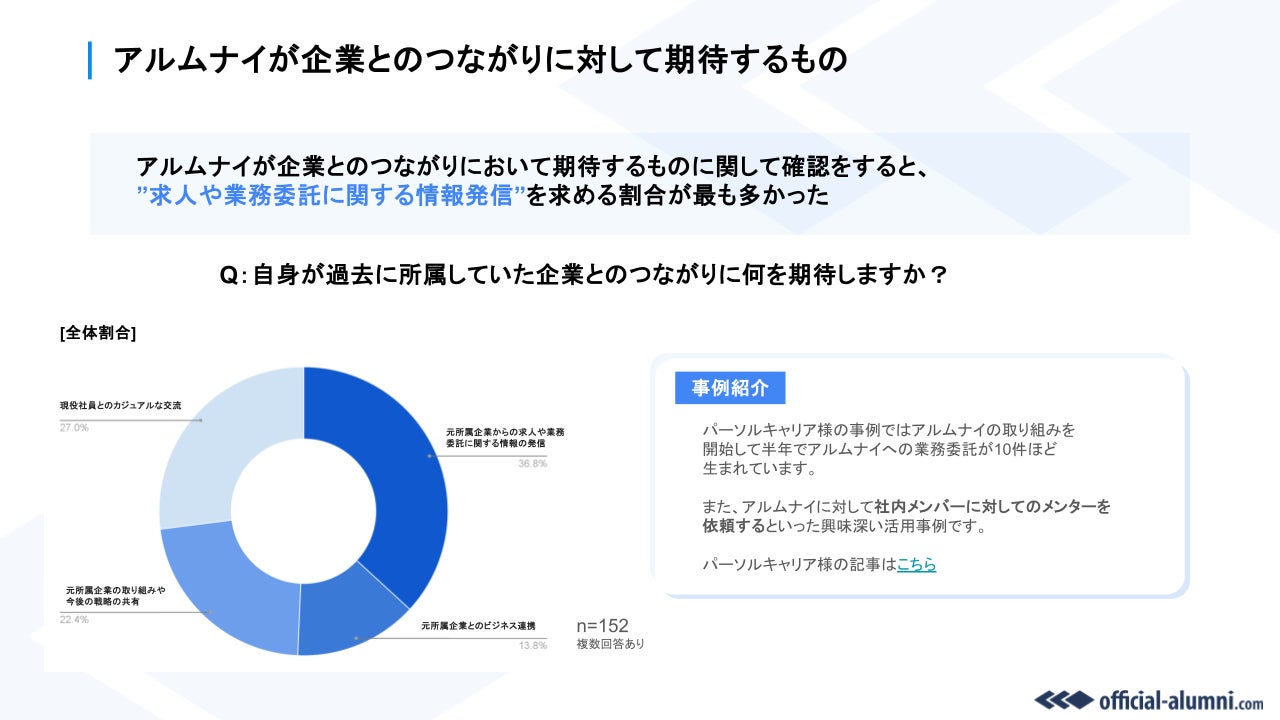 また、つながりを通して期待する内容として、心理的な効用だけでなく、ビジネス情報や求人といった機能的な効用も同時にニーズとしてあるところがアルムナイネットワークならではの特徴とも言えます。