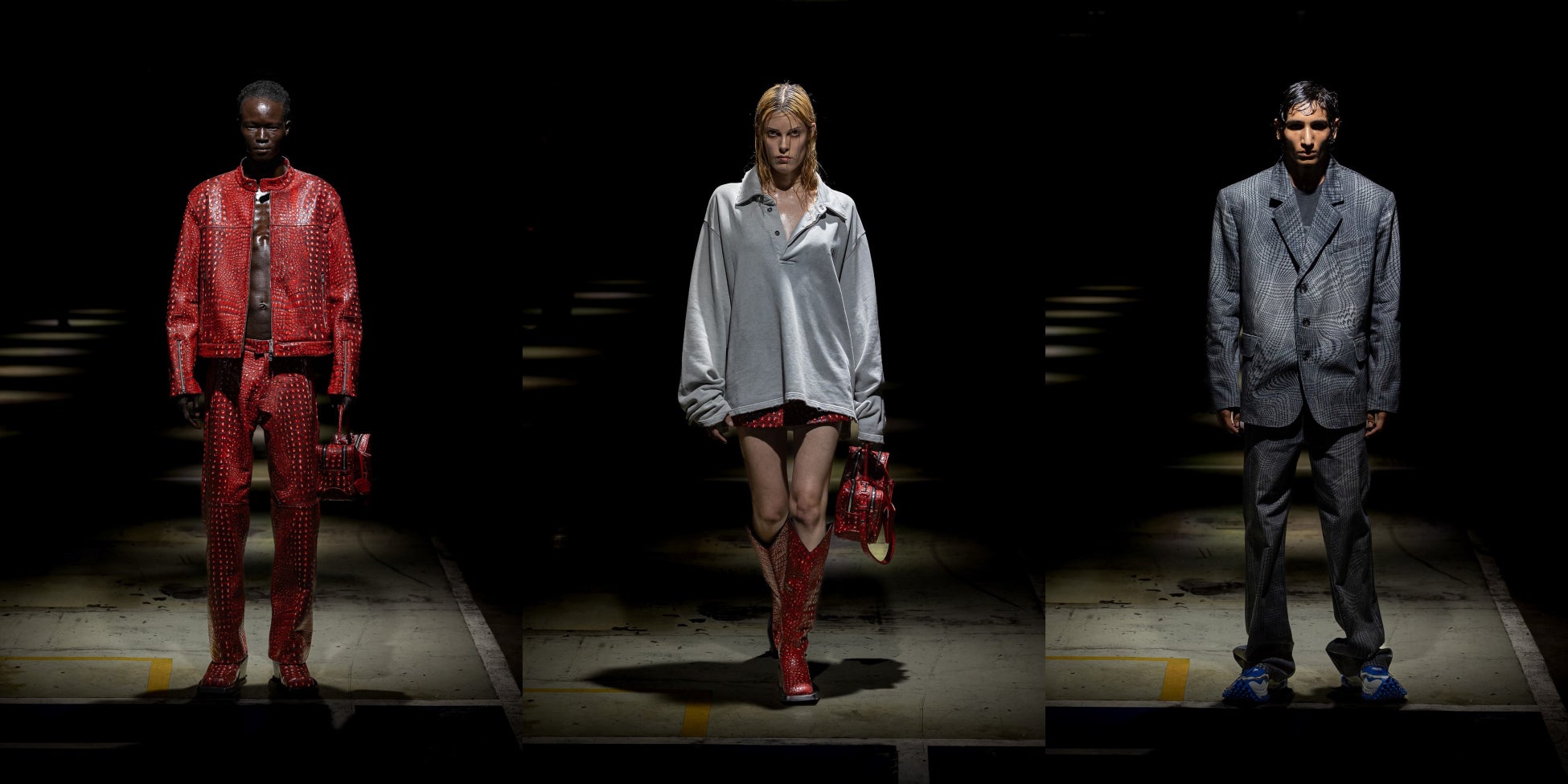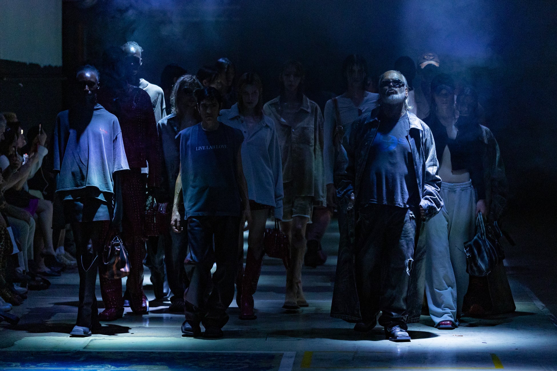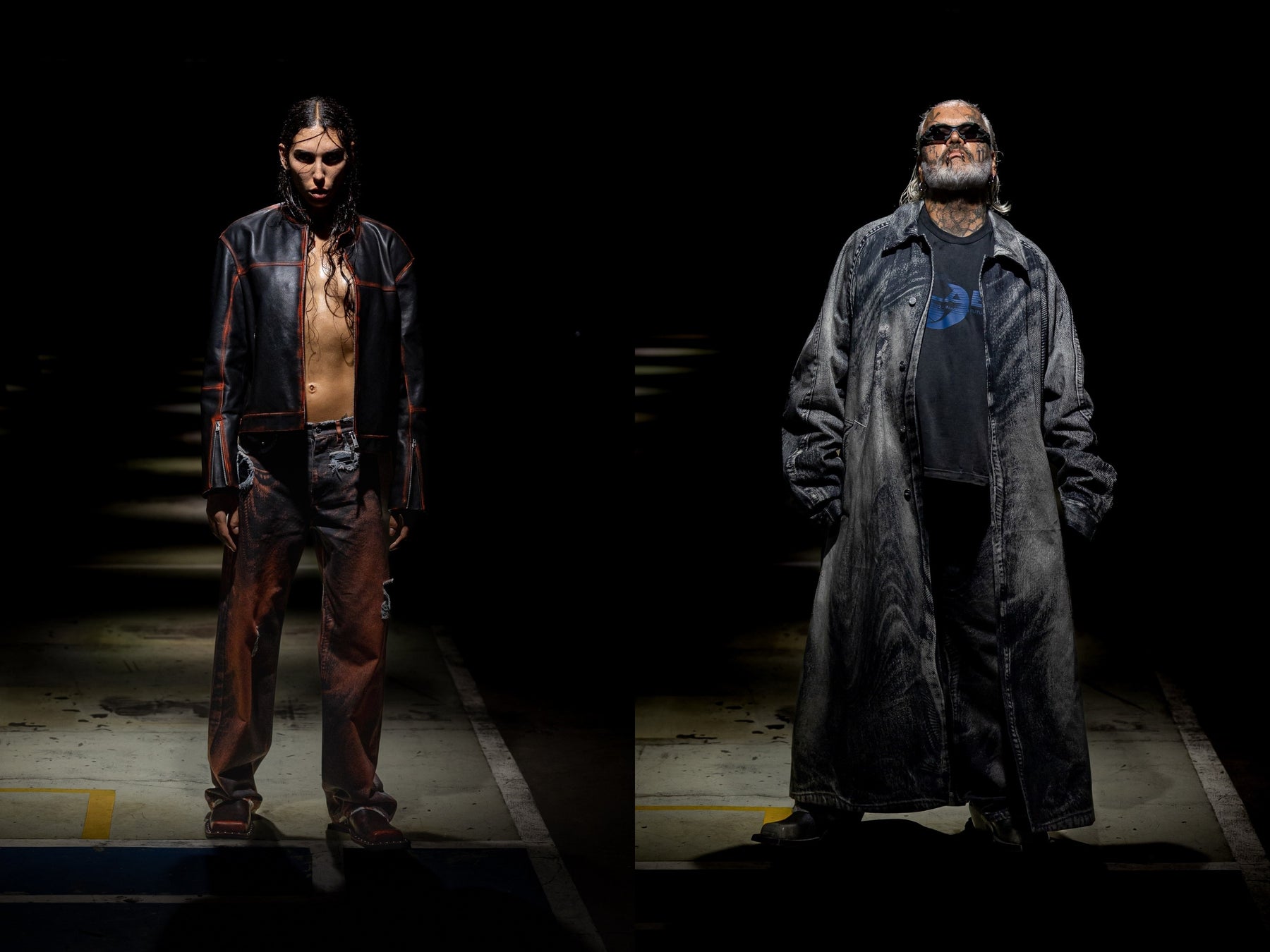 会場は62 Avenue de la Républiqueにある、現在は使われていない立体駐車場。靴職人から本格的なファッションブランドへの進化を象徴する場となりました。光が影から時間を借りる世界を舞台に、スモーキーで薄暗く、蛍光灯が灯る空間で展開され、ディストピアとユートピアが同時に織りなす幻想的な雰囲気は、見る者を一瞬にして別世界へと誘います。青い駐車ディスクという日常的なアイテムの招待状が、コンクリートに包まれたガレージの狂気的な舞台と物語を繋ぎます。メイクはInge Grognard、ヘアスタイリングはLouis Ghewyが手掛け、エンジンオイルに染まり汗にまみれたキャラクターたちがムードを盛り上げます。