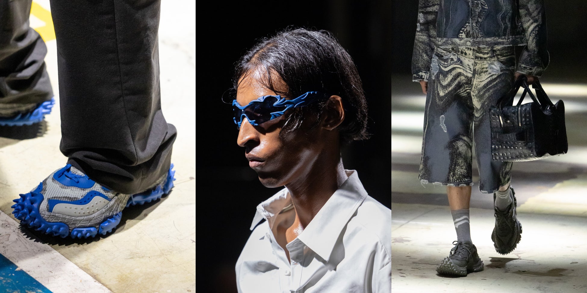 オーバーサイズのプリントデニムコートに加え、CAMPERLABの定番でもあるクロコダイルのエンボス加工レザーと、擦り込まれたヴィンテージライクなレザーをまとったフルコーディネートがステージを飾ります。レザー小物のラインナップも拡大を続けており、「LAUKKU」と「BIG LUNSS」という新しいフォルムが登場し、これまで以上にねじれた歪んだデザインを提供しています。