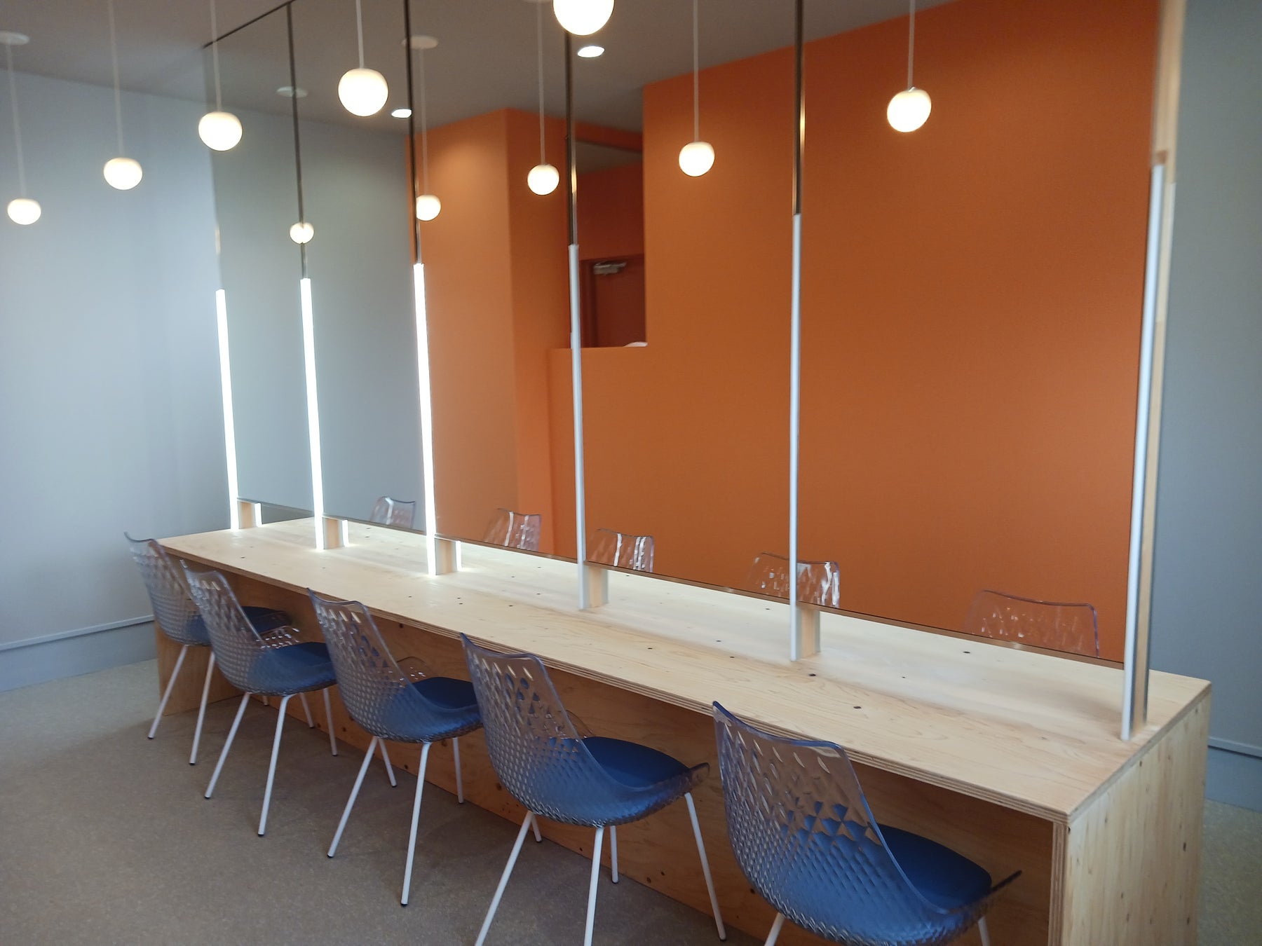 パウダールーム内はオレンジ色を基調として、明るい空間を演出し、メイク直しや身支度が快適にできる洗面スペースや座ってゆったりと整えられるスペースをご用意しております。室内には、ReFaのドライヤーやヘアアイロン、メイクに必要なアメニティ類も取り揃えております。