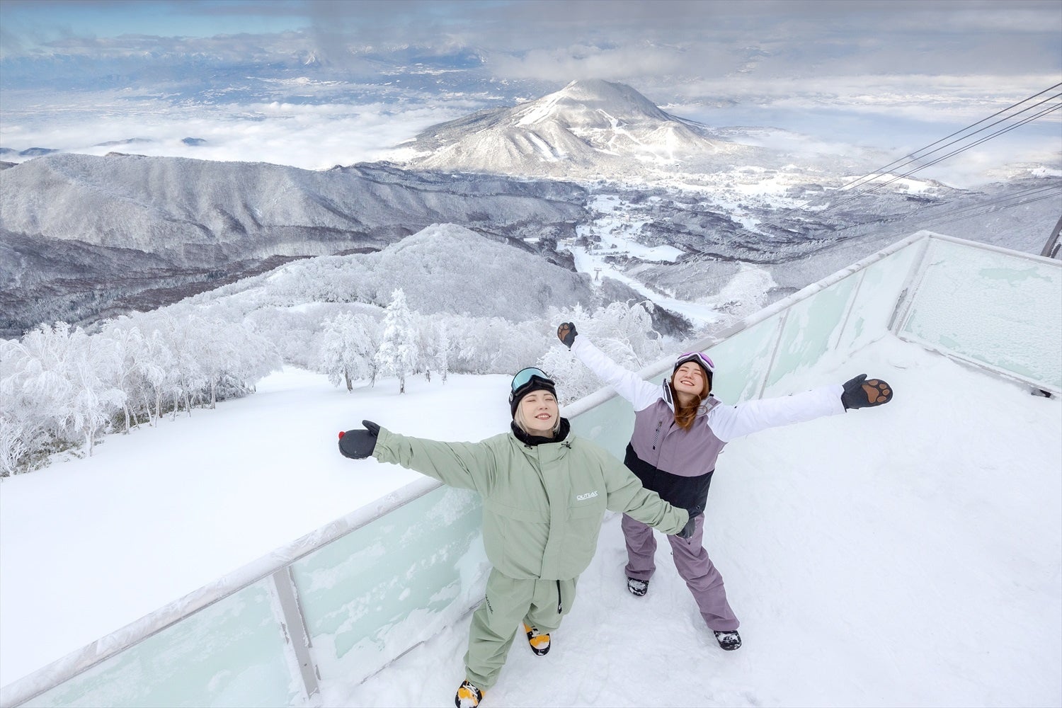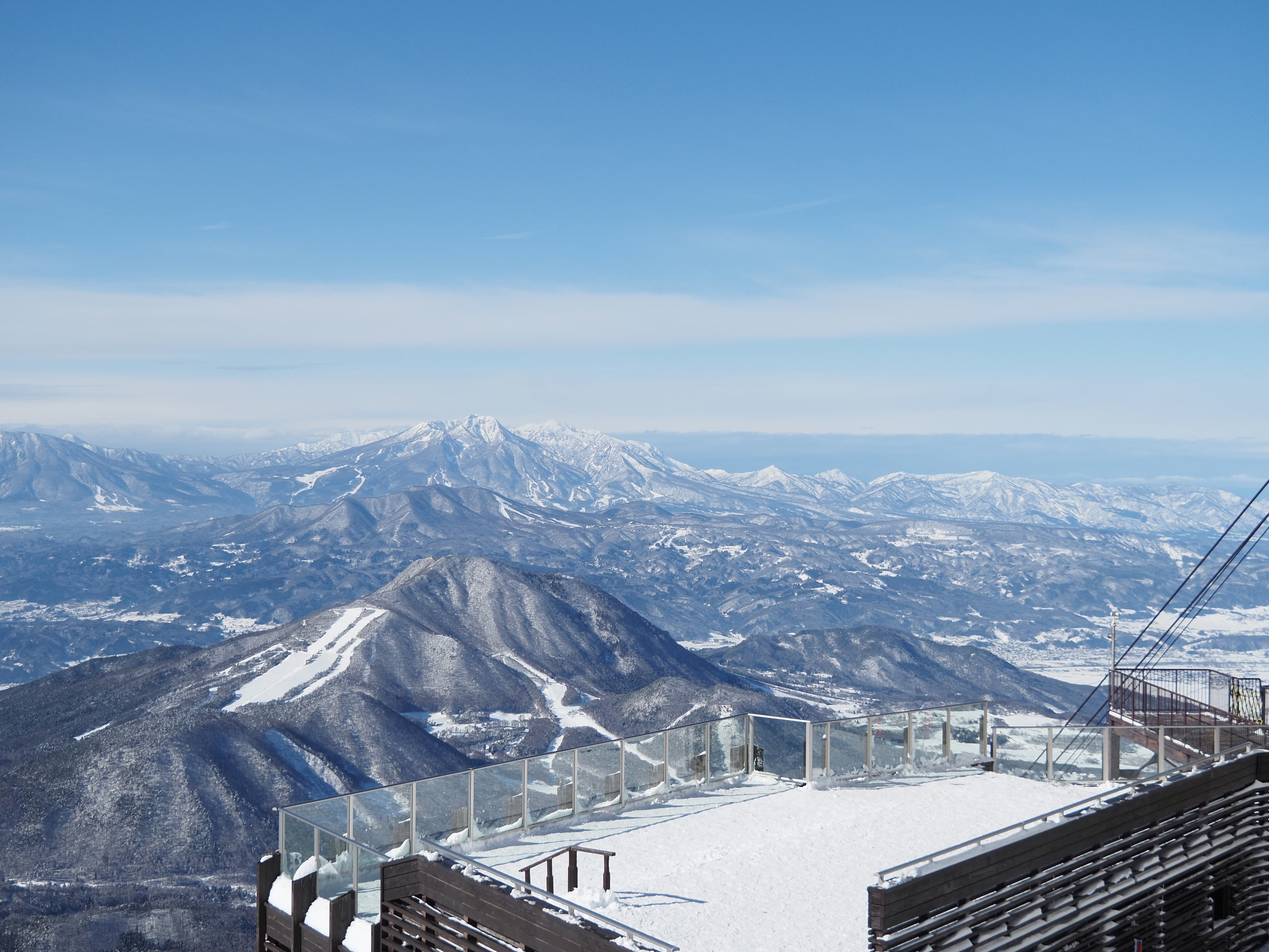 竜王スキーパーク内にある絶景テラス「SORA terrace」は標高1,770mの山頂エリアにあり、北アルプスや日本海、佐渡島まで見渡すことができる人気スポットです。雪に染まった山々や樹氷を背景に絶景映え写真を撮るのがオススメです。