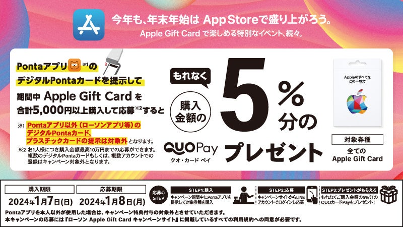 期間中、ローソンでPontaアプリ※1のデジタルPontaカードを提示して、Apple Gift Cardを合計5,000円以上購入して応募※2すると、もれなく購入金額の5%分のQUOカードPayをプレゼント。