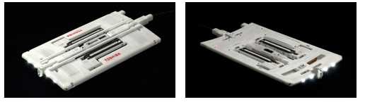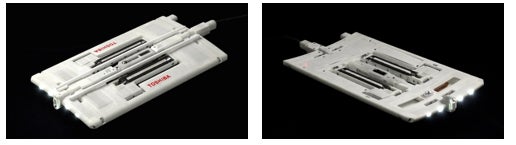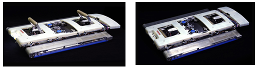 さらに、これまで検査が困難であった小型発電機の検査を可能にする薄型タイプの検査ロボットを開発しました。「薄型検査ロボット」は、固定子鉄心表面に磁力で吸着して走行し、バッフルが取り付けられていない発電機への適用が可能です。「薄型検査ロボット」は、業界最薄クラスの厚さ10mm(突起を含まないフレーム厚さ)であるため、従来、「高機能型検査ロボット」の厚さ33mmでは適用できない狭い構造をもつ発電機に対しても、ロボット検査が可能となります。機能面では、「高機能型検査ロボット」に搭載されているバッフル回避機能と回転子非破壊検査機能を除く品質検査項目一式の検査が可能となっています。