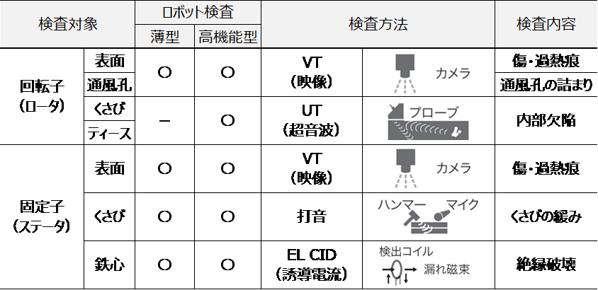 従来は、専門検査員が4年毎に回転子を固定子から引き抜き、タービン発電機の精密検査を実施していました。発電所の稼働率向上のためには、発電機の検査期間の短縮と検査周期の延長が課題であり、短期間で高精度な検査の実施が求められています。