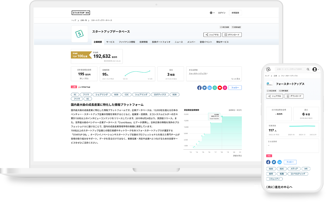 フォースタートアップスは、「(共に)進化の中心へ 」というミッションを掲げ、「for Startups」というビジョンのもと、インターネット/IoTセクターをはじめ、ディープテック等リアルビジネス領域も含めた起業支援と転職支援を中核とした成長産業支援事業を推進。国内有力ベンチャーキャピタルと連携したスタートアップ・ベンチャー企業への戦略的資⾦⽀援や、成長産業領域に特化した情報プラットフォーム「STARTUP DB(スタートアップデータベース)」の運用、及び、大企業とのビジネス共創モデルによる産業エコシステム強化にも取り組む。