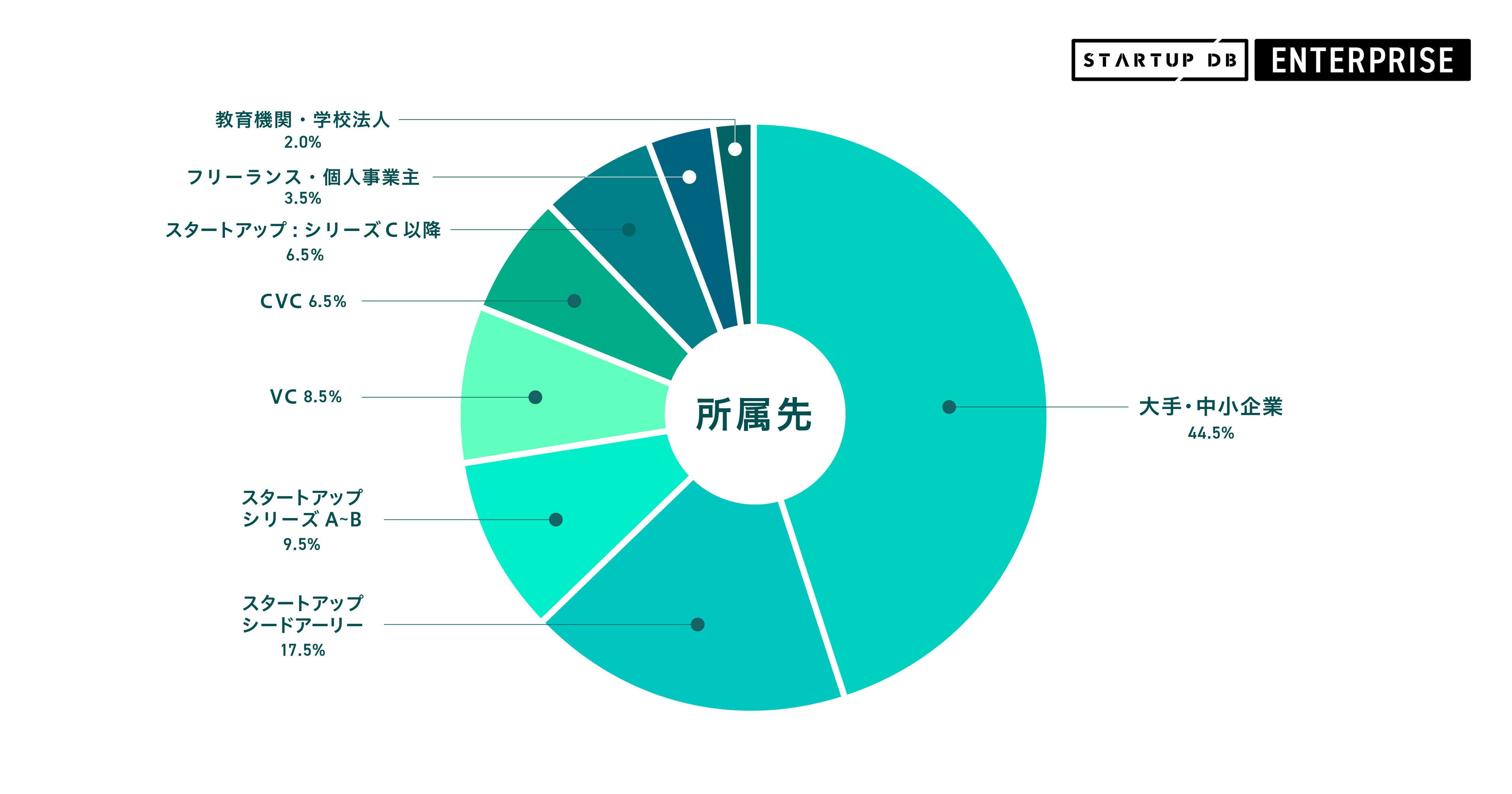 『STARTUP DB』の無料会員様に向けて2022年5月に調査したアンケートの回答企業の属性として、約半数は44.5%が大手・中小企業、次いでスタートアップ企業が33.5%、VC/CVCが15%と、共創を望む事業会社様の割合が高い状況です。『STARTUP DB』に望むサポートとして、約30%が「自社の協業テーマに沿ったスタートアップの紹介やレコメンド」と回答しており、「営業支援/スタートアップ紹介」も含めると35%もの方々が『STARTUP DB ENTERPRISE』が提供している専任担当者による「スタートアップとの引き合わせや壁打ち支援」が求められていることが明らかになりました。