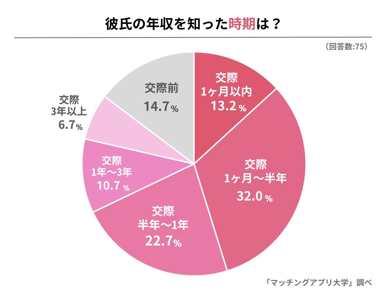 彼氏の年収を知った時期も教えてもらいました。もっとも多かったのはお付き合いしてから「1ヶ月~半年」の32.0%で、続いて「半年~1年」の22.7%。「交際前」に知った人も14.7%いました。