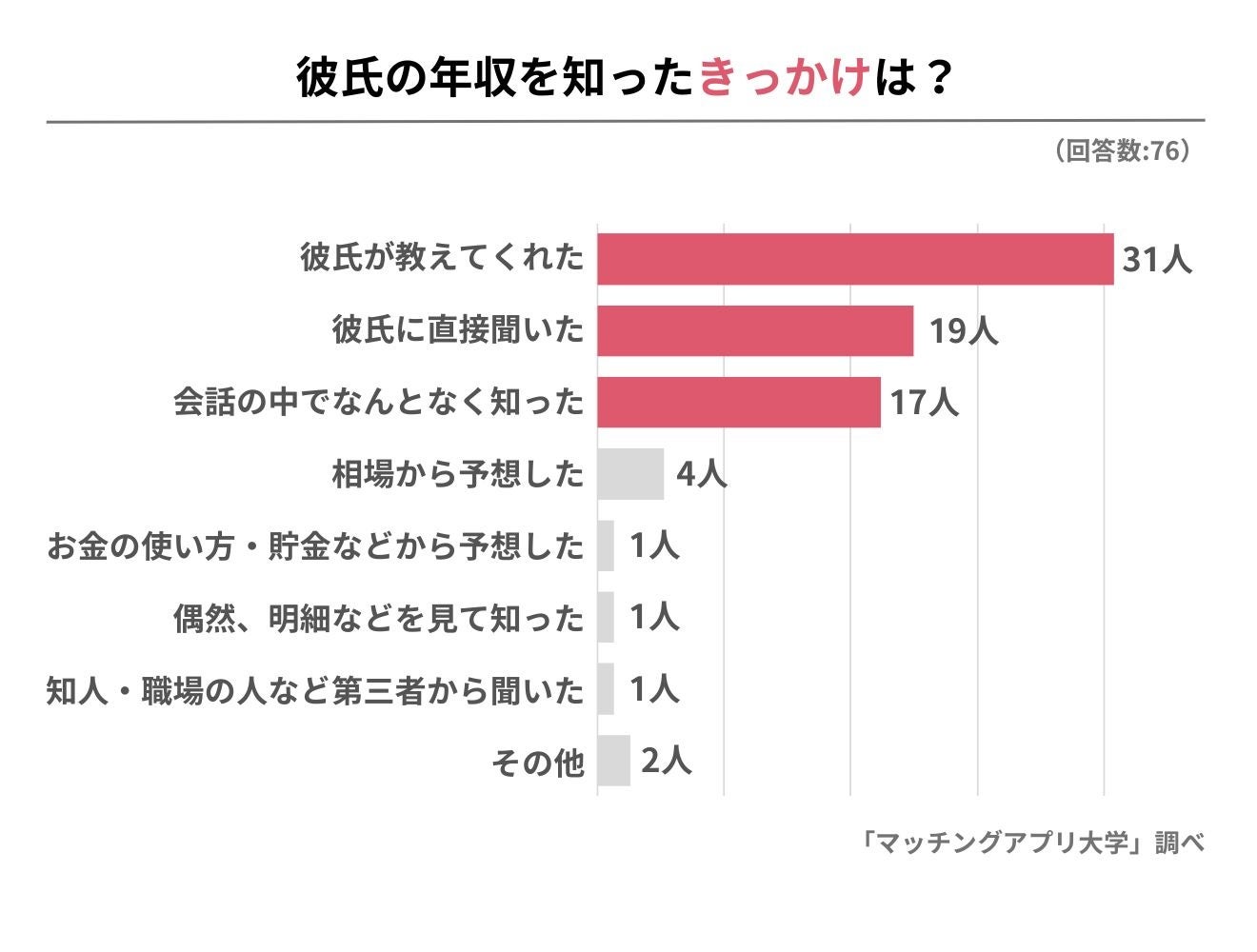 彼氏の年収を知ったきっかけ1位は、76人中31人が回答した「彼氏が教えてくれた」で、2位は「彼氏に直接聞いた」の19人でした。彼氏が自ら年収を話してくれると、自分との交際や将来に対する真剣さを感じるようです。
