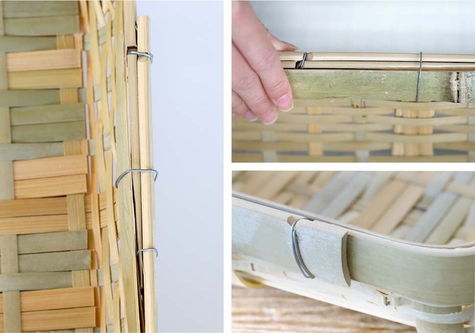 特筆すべきは、底部分の構造です。底部分は傷みやすいため、幅広の力竹が何本も交差して頑丈な作りとなっています。内底もしっかり編み込まれており、重量のあるものでもしっかりと運ぶことができます。さらに、竹のしなりを活かし、重たい荷物を入れて持ち運ぶ際の強い衝撃を竹の柔軟さがいなし、ショックを和らげることで籠の耐久性を高めています。硬さと柔らかさという一見相反する性質を併せ持つ、まさに竹ならではの最強の角水切り籠です。