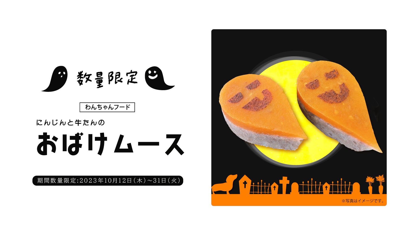 このたび、販売する期間限定わんちゃん用メニュー『おばけムース』は、当社運営店舗で使用している牛たんを使用しており、季節に合わせいたずらをするオバケをモチーフにし見た目にも楽しめるハロウィーン期間限定メニューとなっております。
