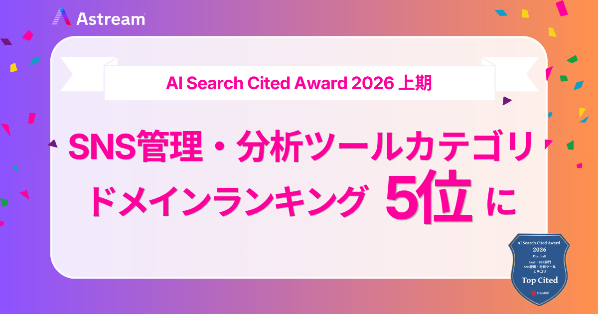 株式会社A(以下、当社)は、SNS分析ツール「Astream(エーストリーム)」を提供する企業として、【AI Search Cited Award 2026 上期】において、SaaS・BtoB領域の「SNS管理・分析ツールカテゴリ ドメイン引用ランキング」5位に選出されました。