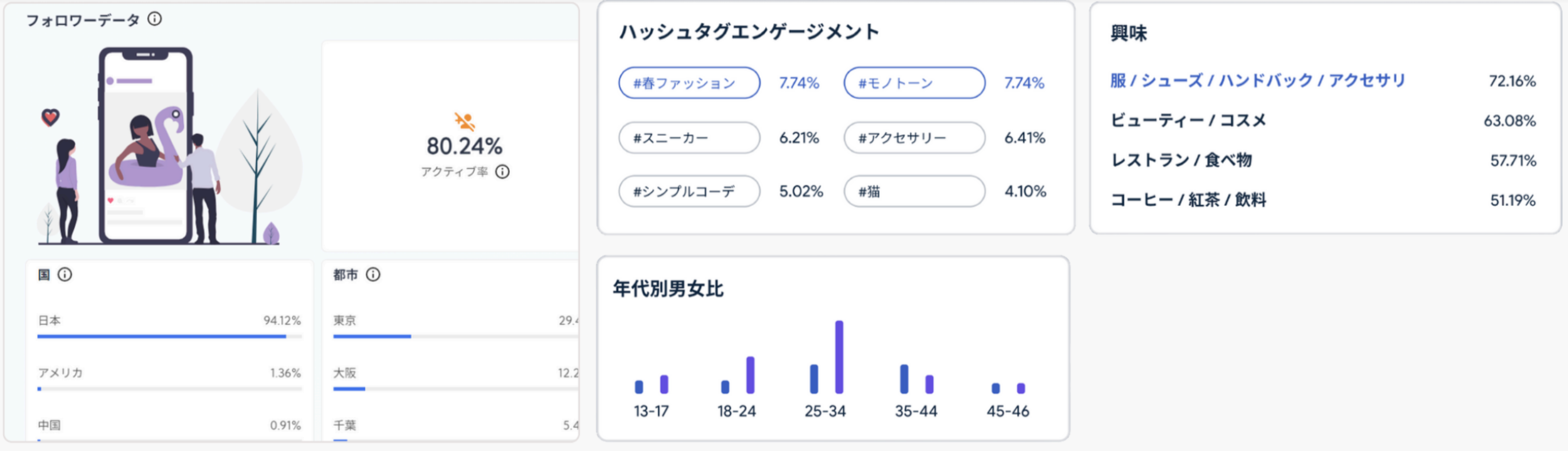 ※Astreamの管理画面では、フォロワー属性やエンゲージメントデータなど、インフルエンサー選定に役立つさまざまな分析データを確認することができます。