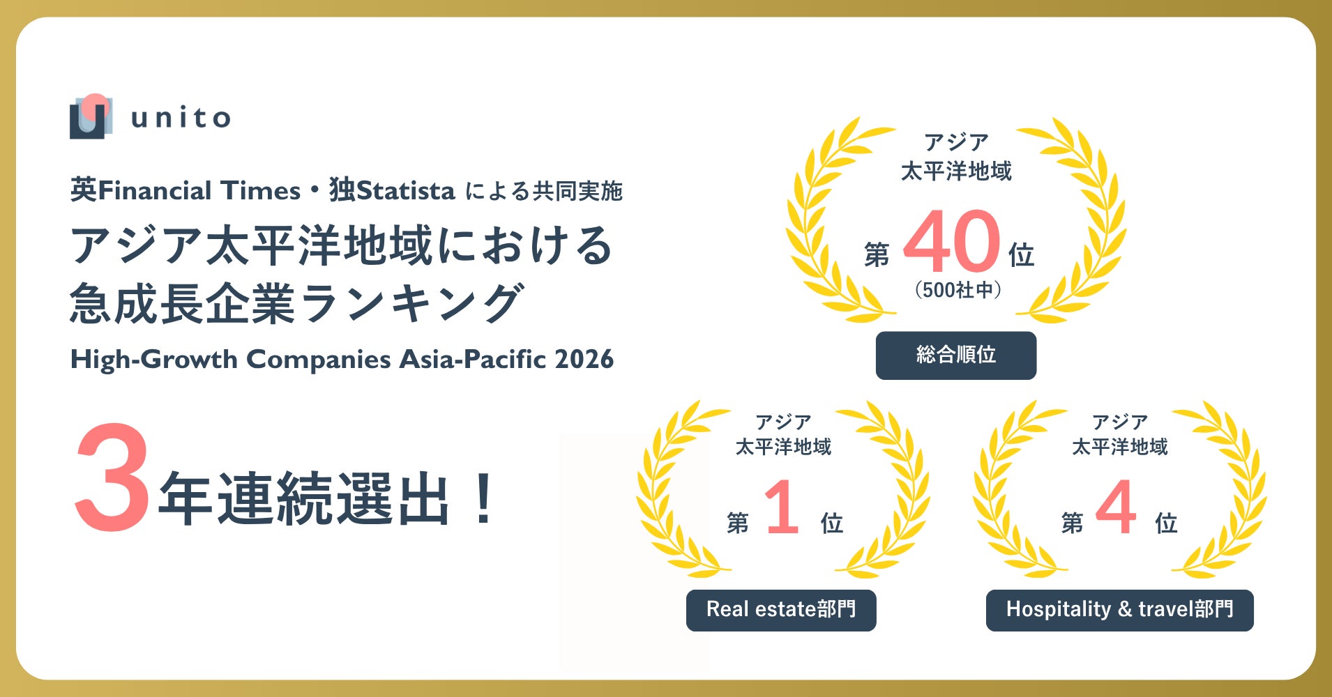 留守の日は家賃が下がる住まい「unito」を提供する株式会社Unito(本社:東京都目黒区、代表取締役:近藤佑太朗、読み:ユニット、以下当社)は、イギリスの有名経済紙「Financial Times」とドイツの統計調査会社「Statista」が共同で実施する「High-Growth Companies Asia-Pacific 2026(アジア太平洋地域における急成長企業ランキング2026)」に、3年連続で選出されました。