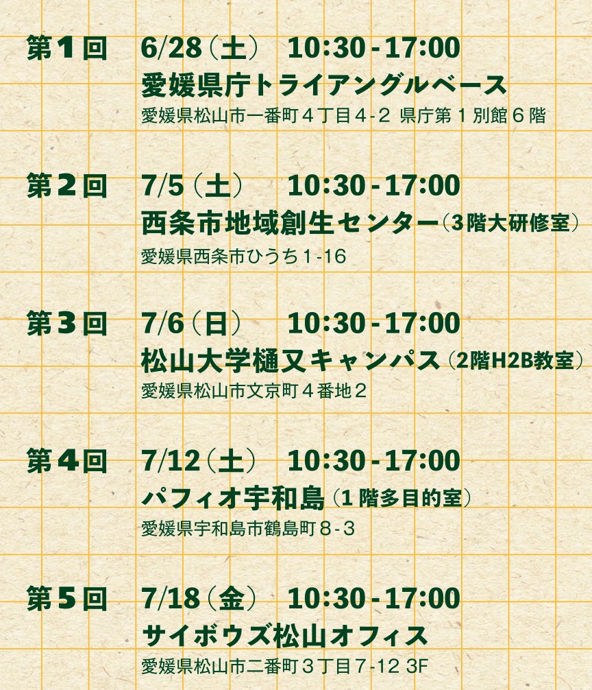 本プログラムの前半戦として、6月末から愛媛県内計5会場において、体系的な新規事業創出ノウハウを学ぶセミナーを開催しますのでお知らせします。