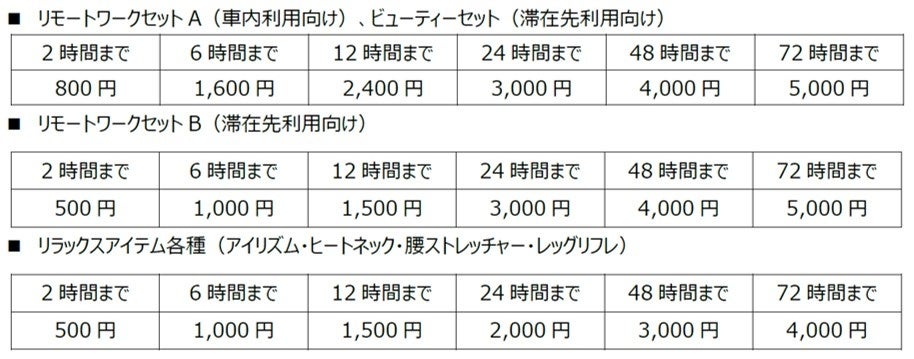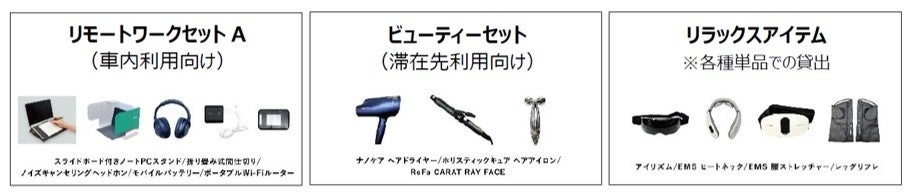 新幹線車内や滞在先でのリモートワークに使えるWi-Fiルーターやモバイルモニターなどのセット、仕事の合間の目や肩などのリフレッシュに使えるリラックスアイテム、および滞在先でのリフレッシュで活用できるヘアアイロンや美顔器などのセットを、駅で借りて駅で返すことができる新しいサービスです。