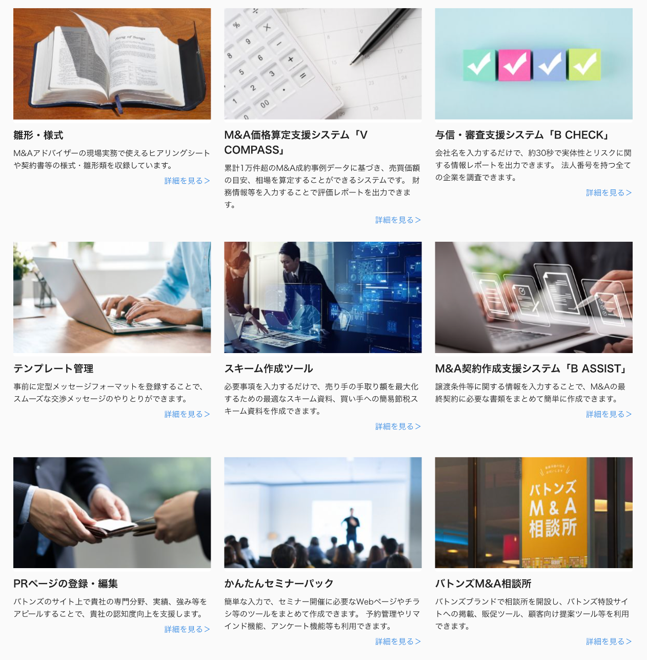 「BATONZ」は「誰でも、何処でも、簡単に、自由に、M&Aが出来る社会を実現する」というビジョンのもと運営されているM&A総合支援プラットフォームです。具体的には、買い手・売り手・M&Aアドバイザーが三方向でマッチングできるプラットフォームと、M&Aアドバイザー向けの教育コンテンツや業務支援システム、金融機関専用M&A支援システム「B MASS(ビーマス)」などを提供しています。