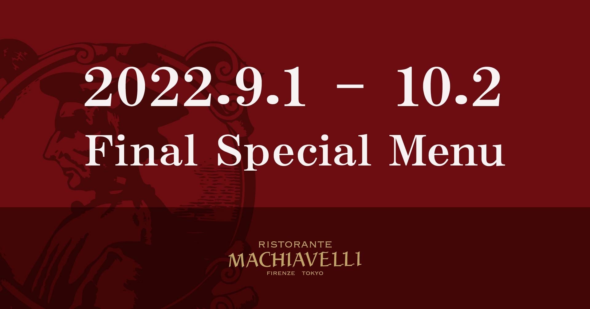 フィナーレを飾るディナーのプリフィックスコースでは、皆様から特にご好評いただいたお料理で構成した「スペシャルコース」(8,500円)をご用意いたします。旬の食材を使用したメニュー8品に、当店でしか飲むことのできないマキャベリの赤ワイン“イルプリンチペ”をグラスでお付けする特別コースです。