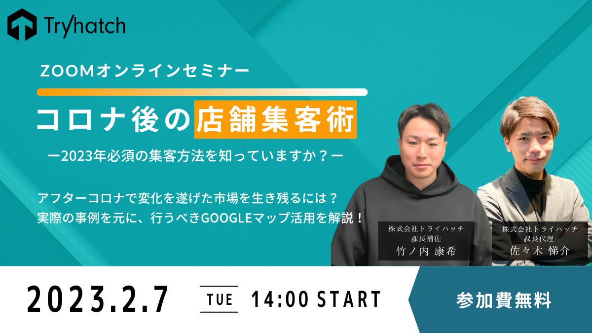 株式会社トライハッチ(所在地:東京都新宿区、代表取締役:武藤 尭行、以下「トライハッチ」)は、コロナ後の店舗集客術!〜アフターコロナで変化を遂げた市場を生き残るには?〜 のWebセミナーを株式会社トライハッチ主催にて2023年2月7日(火)14:00~15:00に開催いたします。