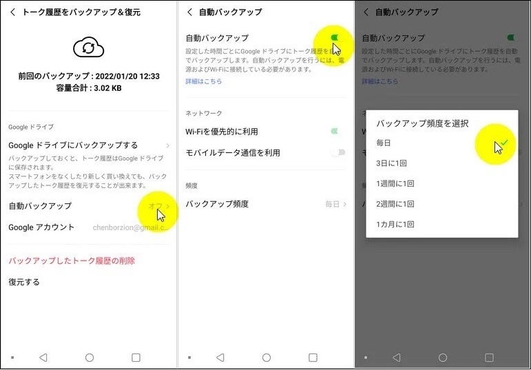 「トーク履歴のバックアップ・復元」から「自動バックアップ」をオンに切り替えて、バックアップ頻度を選択します。