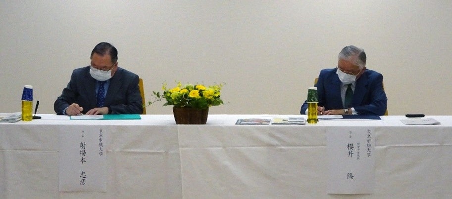 協定調印の様子(左:東京電機大学 射場本学長 右:本学 櫻井学長)