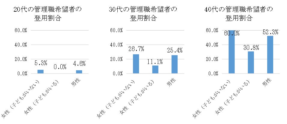 ・女性の管理職希望者の登用割合においては、子どもの有無で大きな差が生まれており、女性の管理職