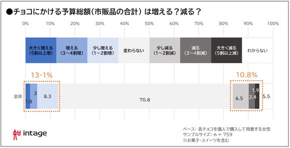 次に、個人で用意するチョコレートの予算(市販品の合計)増減を見てみましょう。昨年と比較して予算総額は「変わらない」と回答した人が最も多く、次いで「増える(13%)」「減る(11%)」となりました(図表3)。
