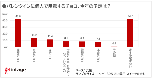 今年のバレンタインに「なにチョコ(だれ向け)」を用意するかを女性に質問したところ、「家族チョコ」が42%と最も多く、続いて「自分チョコ」(13%)「友チョコ」(11%)となりました(図表1)。