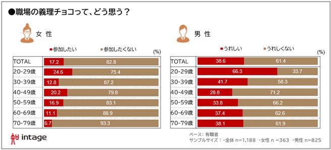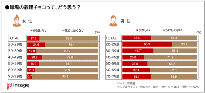 最後に、図表1の通り、義理チョコを渡す人は全体の1割に満たない結果となっていますが、義理チョコはもはや消滅の危機なのでしょうか。有職者の男女それぞれに「職場の義理チョコ」に対する考え方・感じ方を尋ねました。