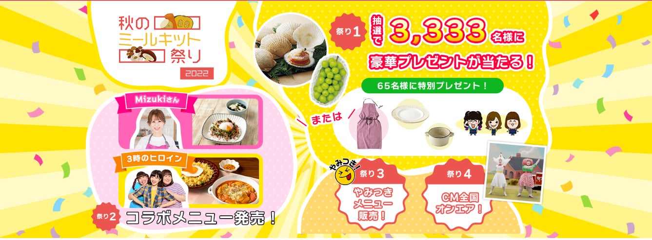 昨秋、ご好評をいただいた大人気企画『ヨシケイ 秋のミールキット祭り』を今年も開催。9/12週から5週間にわたって実施される『ヨシケイ 秋のミールキット祭り 2022』の注目ポイントは、人気料理研究家Mizukiさんや3時のヒロインと開発したコラボメニュー!また、キャンペーン期間中Cut Mealコースにおいて毎週販売される「やみつきメニュー」のミールキットで、食卓を楽しく彩ります。