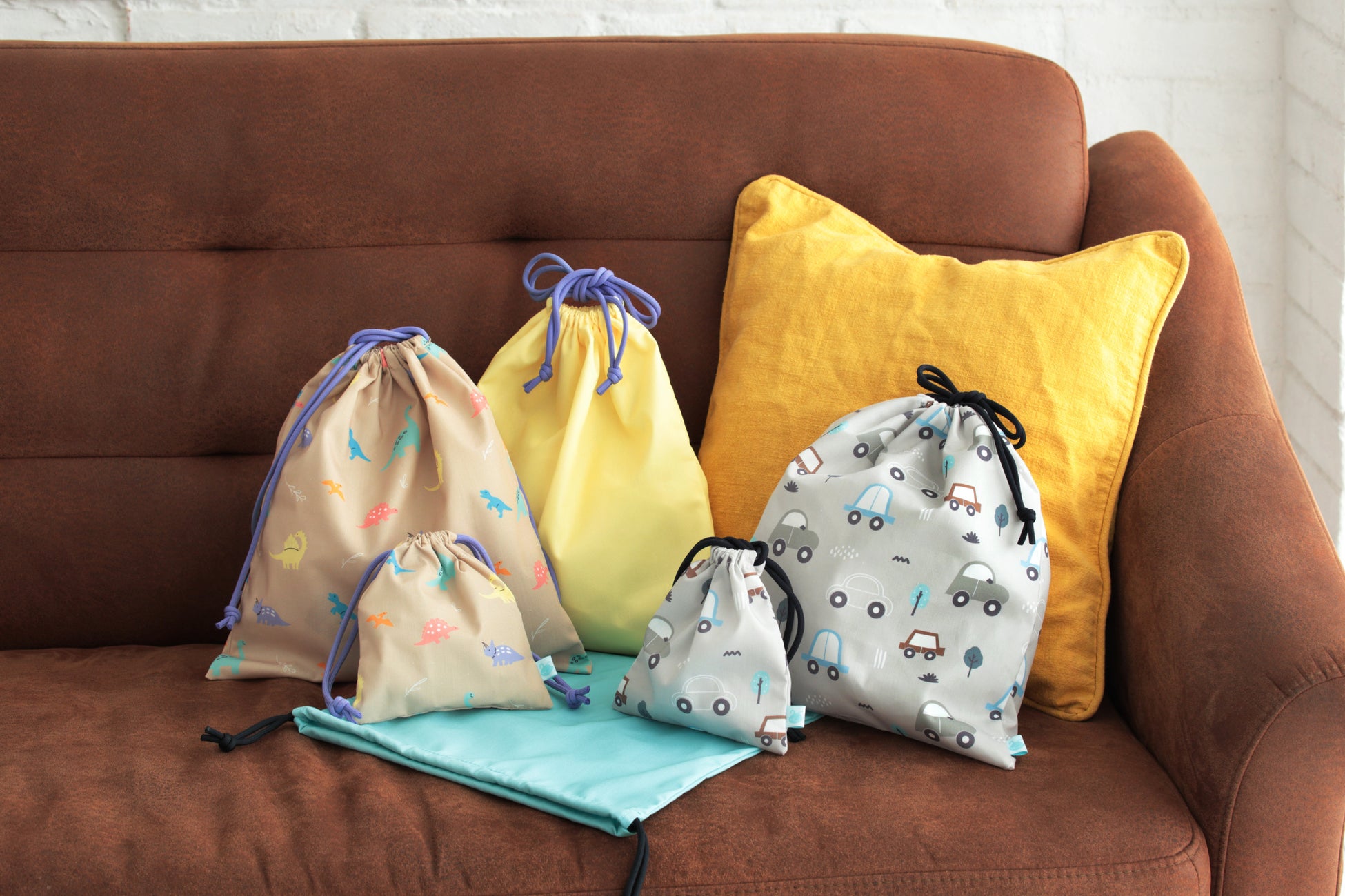 大サイズ2枚、小サイズ1枚入りの3枚セット。大サイズは柄と無地の2枚で、お着替え入れやシューズケース入れとして使い分け可能。小サイズはコップ入れに最適です。全てお名前タグ付き。洗濯機でお手入れ可能です。