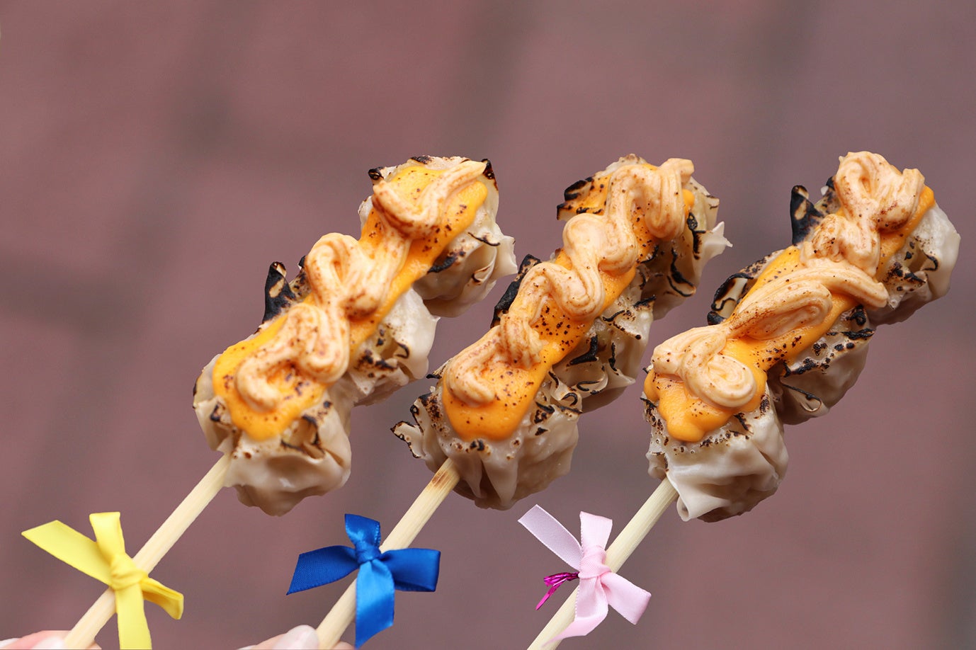 建物入口にある「富貴包子楼」では、好きなリボンの色が選べるワンハンドフードを販売。