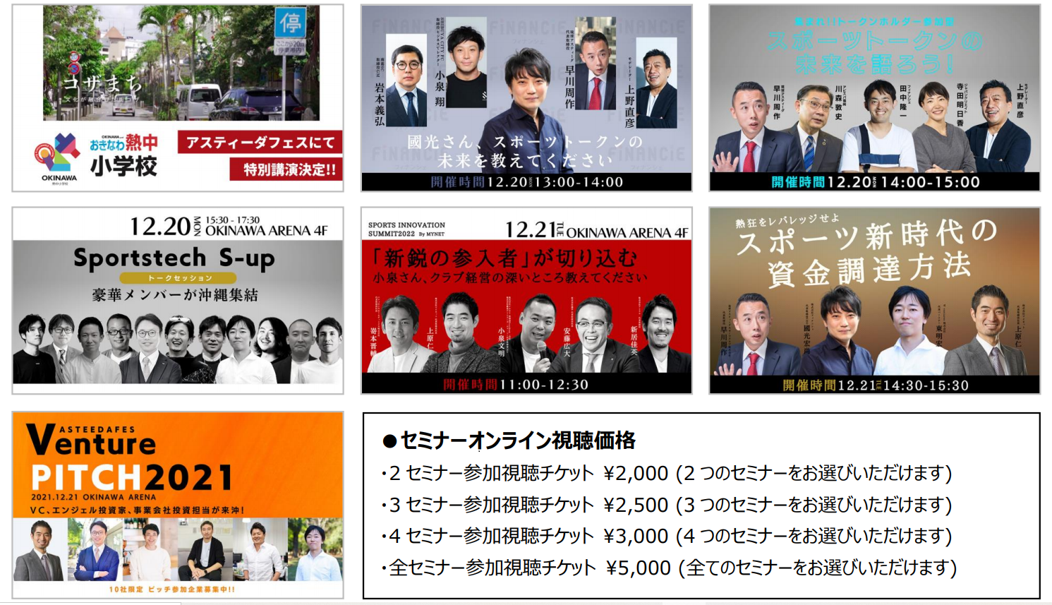 2021年12月20日(月)、21日(火)に沖縄アリーナで初めて開催される琉球アスティーダの祭典「アスティーダフェスティバル2021-2022」。“スポーツ!音楽!食!最高のエンターテインメントを!”のテーマのもと、1日中楽しめるさまざまなコンテンツを展開する予定ですが、今回はオンラインビジネスセミナーをご案内いたします。withコロナ時代のコロナ復興イベントと位置づけられている本イベントでは、「スポーツ イノベーション オキナワ」の傘のもと、各界のスペシャリストや新進気鋭の経営者が勢ぞろいしたビジネスセミナーを数多く展開。中でも今回改めてご紹介する7つのセミナーはオンラインでのライブ配信を実施いたします。全国どこからでも参加できるセミナーとなっておりますのでぜひ、ご視聴・ご参加ください!