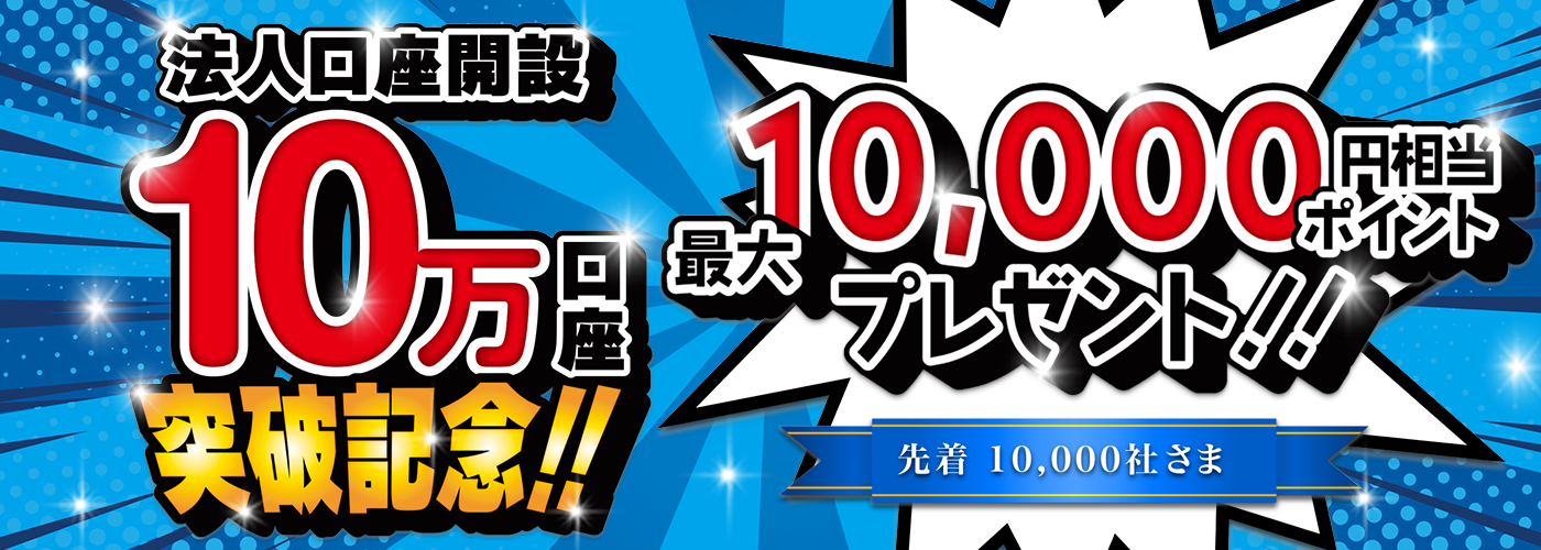 また、上記を記念して、法人口座の開設とご利用で最大10,000ポイントをプレゼントするキャンペーンを開催しております。法人口座をご検討中のお客さまは大変お得なこの機会にぜひご検討ください。