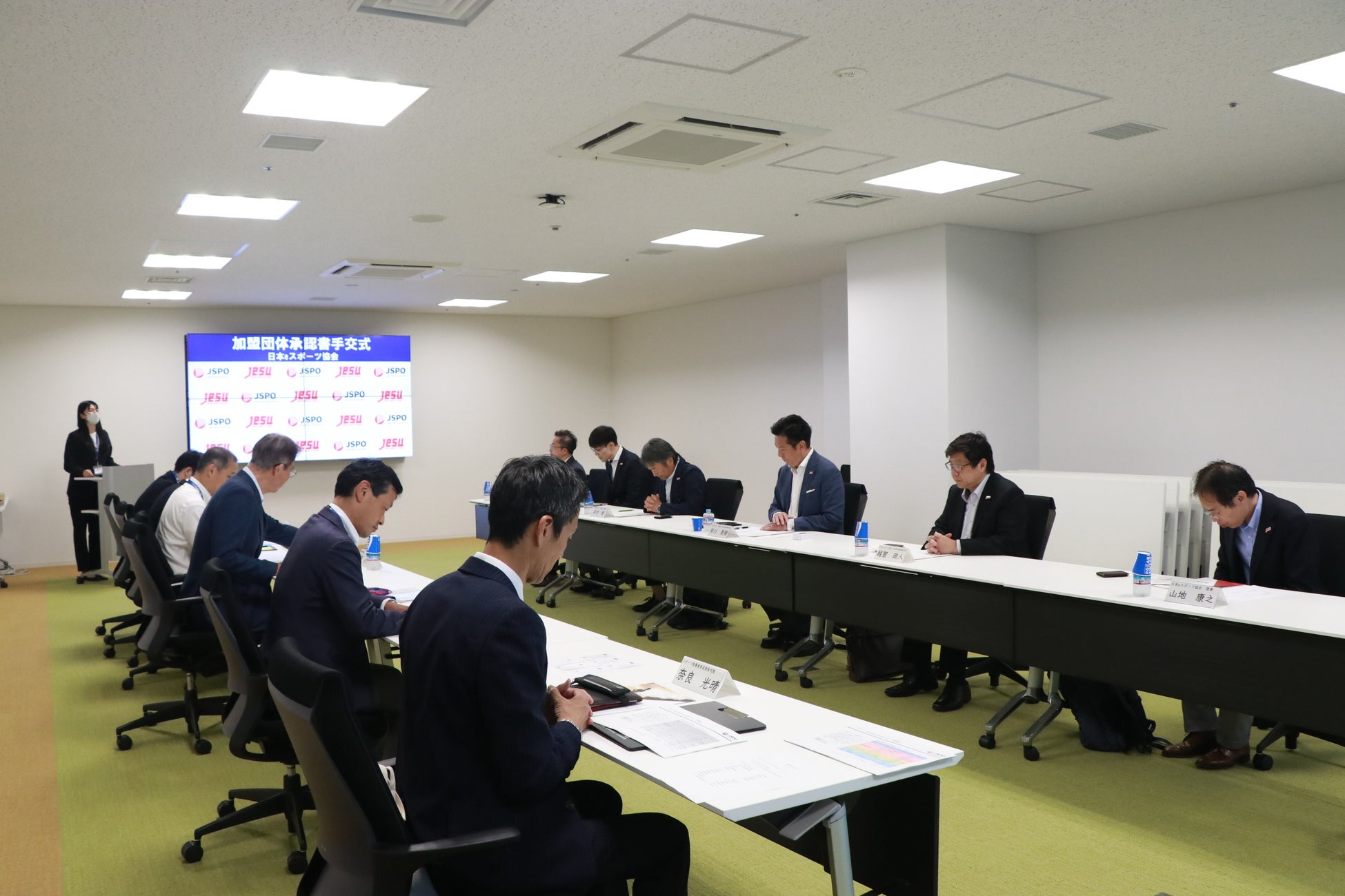 手交式は、JSPOにおいて行われ、JSPO・森岡専務理事からJESU・早川会長に加盟団体承認書が手渡されました。手交式の後は、両団体の理事も交えて、国内外におけるeスポーツ競技の動向や、部活動推進をはじめとするeスポーツ普及・振興、JSPOの指導者育成制度などについて幅広く意見交換を行いました。