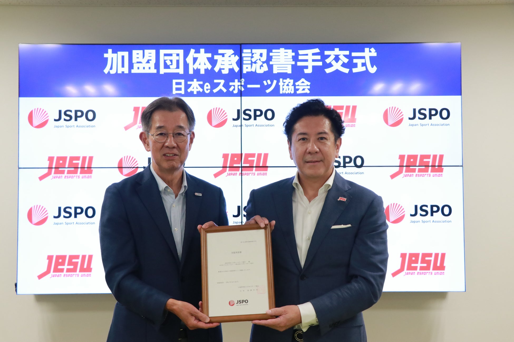 一般社団法人日本 e スポーツ協会(会長:早川英樹 以下、JESU)は、8月5日(火)、公益財団法人日本スポーツ協会(以下、JSPO)にて行われた加盟団体承認書手交式に出席し、承認書を受領したことをお知らせします。
